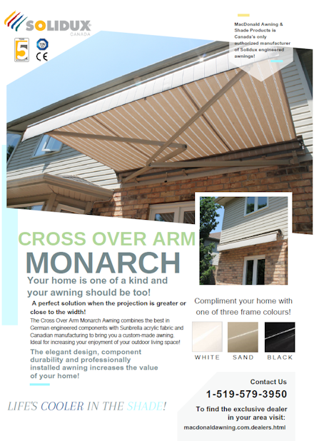 A perfect solution when the projection is greater or close to the width! The Cross Over Arm Monarch Awning combines the best in German engineered components with Sunbrella acrylic fabric and Canadian manufacturing to bring you a custom-made awning. Ideal for increasing your enjoyment of your outdoor living space!